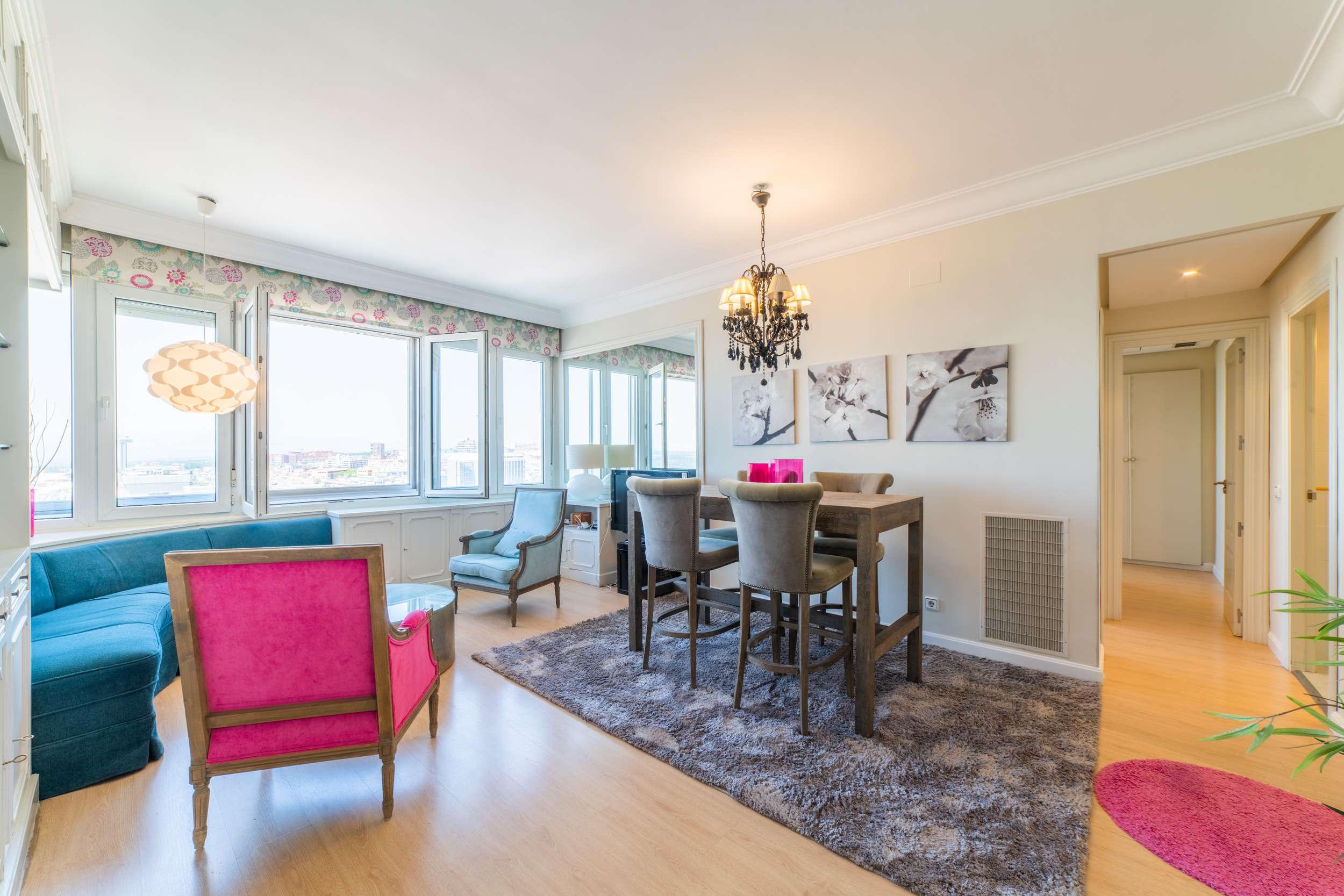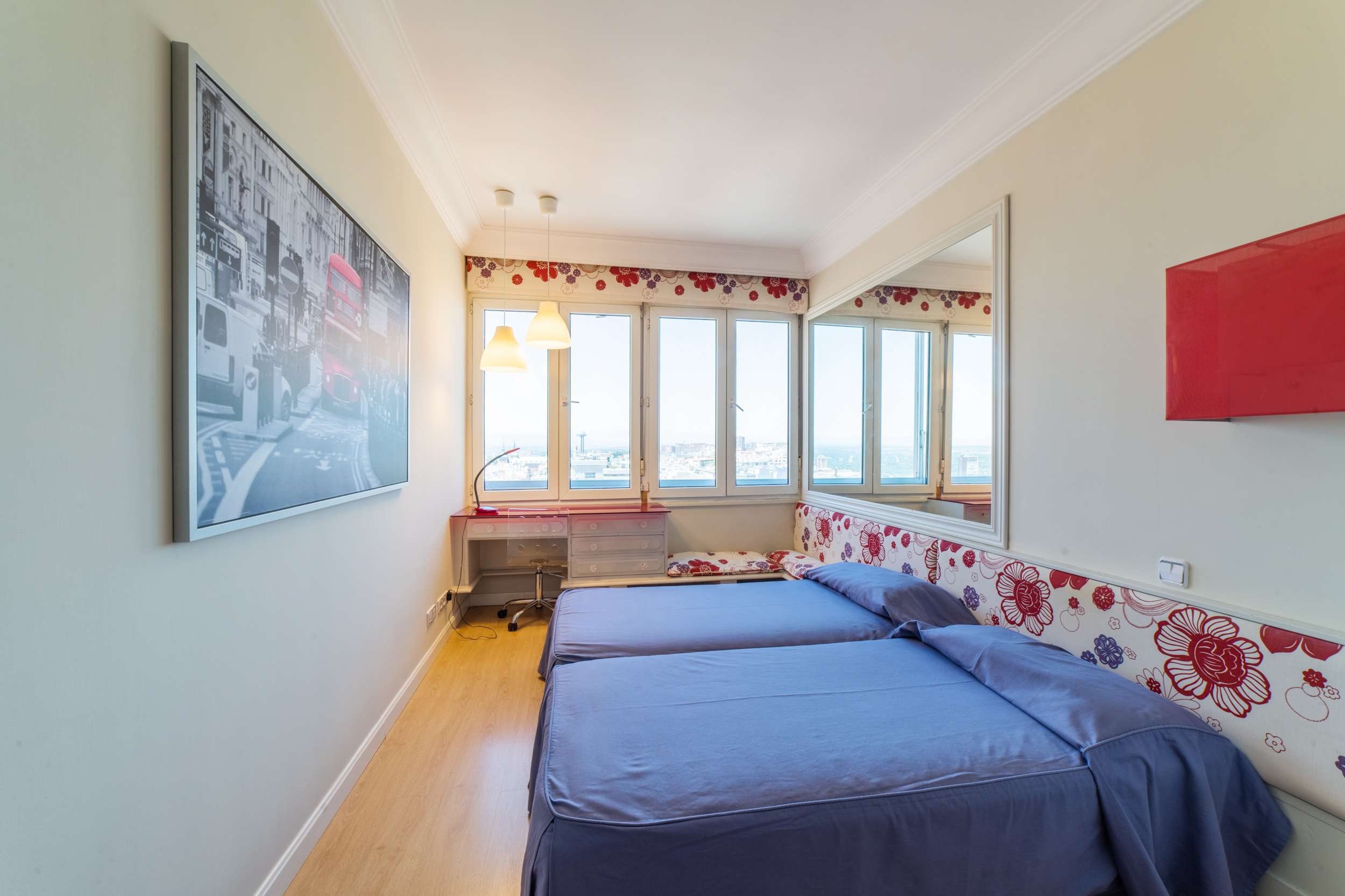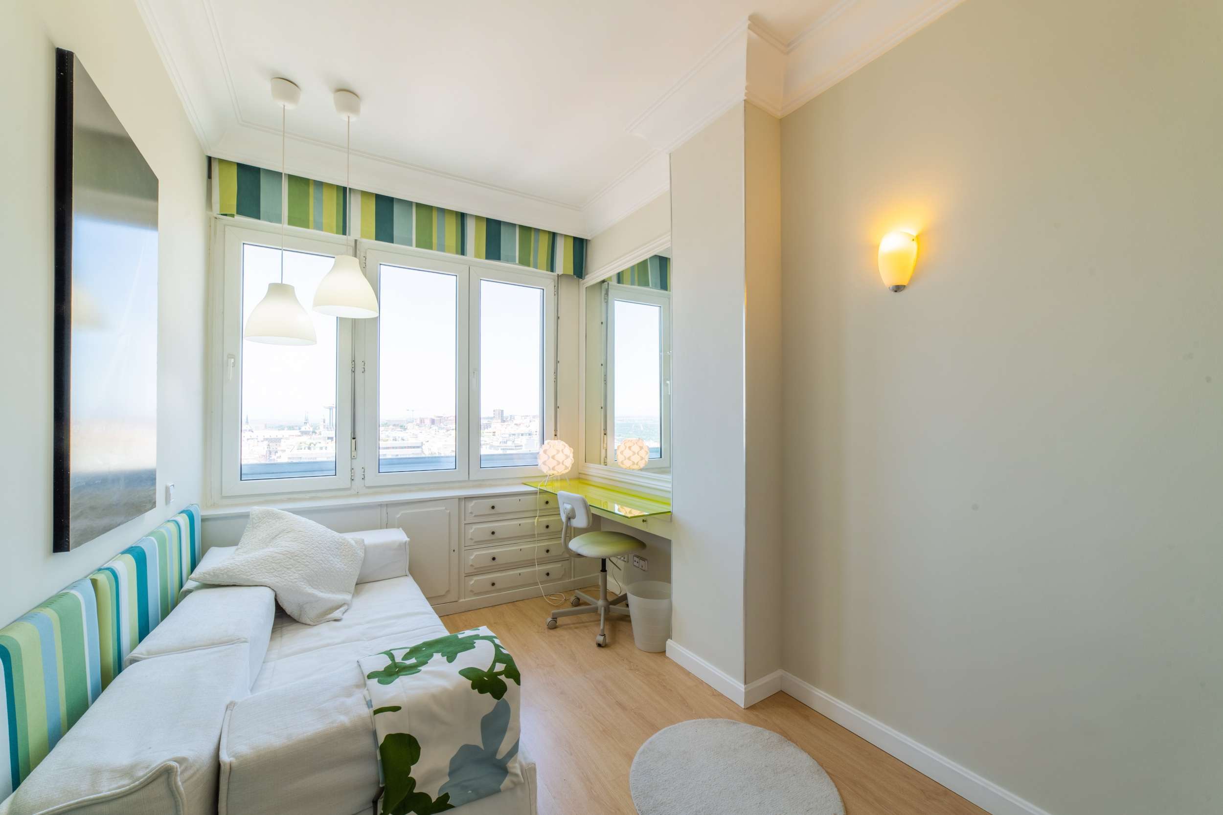 En la decimoctava planta, apartamento de esquina. Super luminoso y alegre. No hace falta decoración, el cuadro se ve a través de las ventanas, la luz inunda las estancias, solo viviendo aquí pueden disfrutarse de este cuadro tan singular.