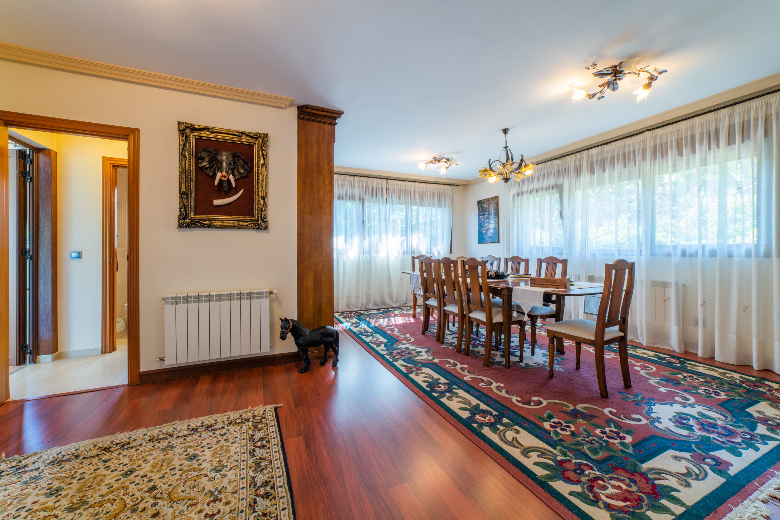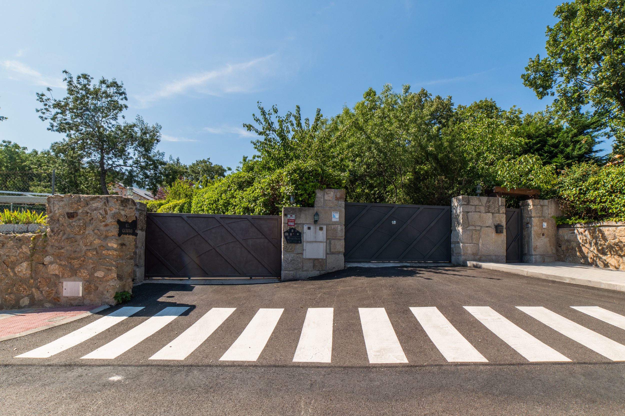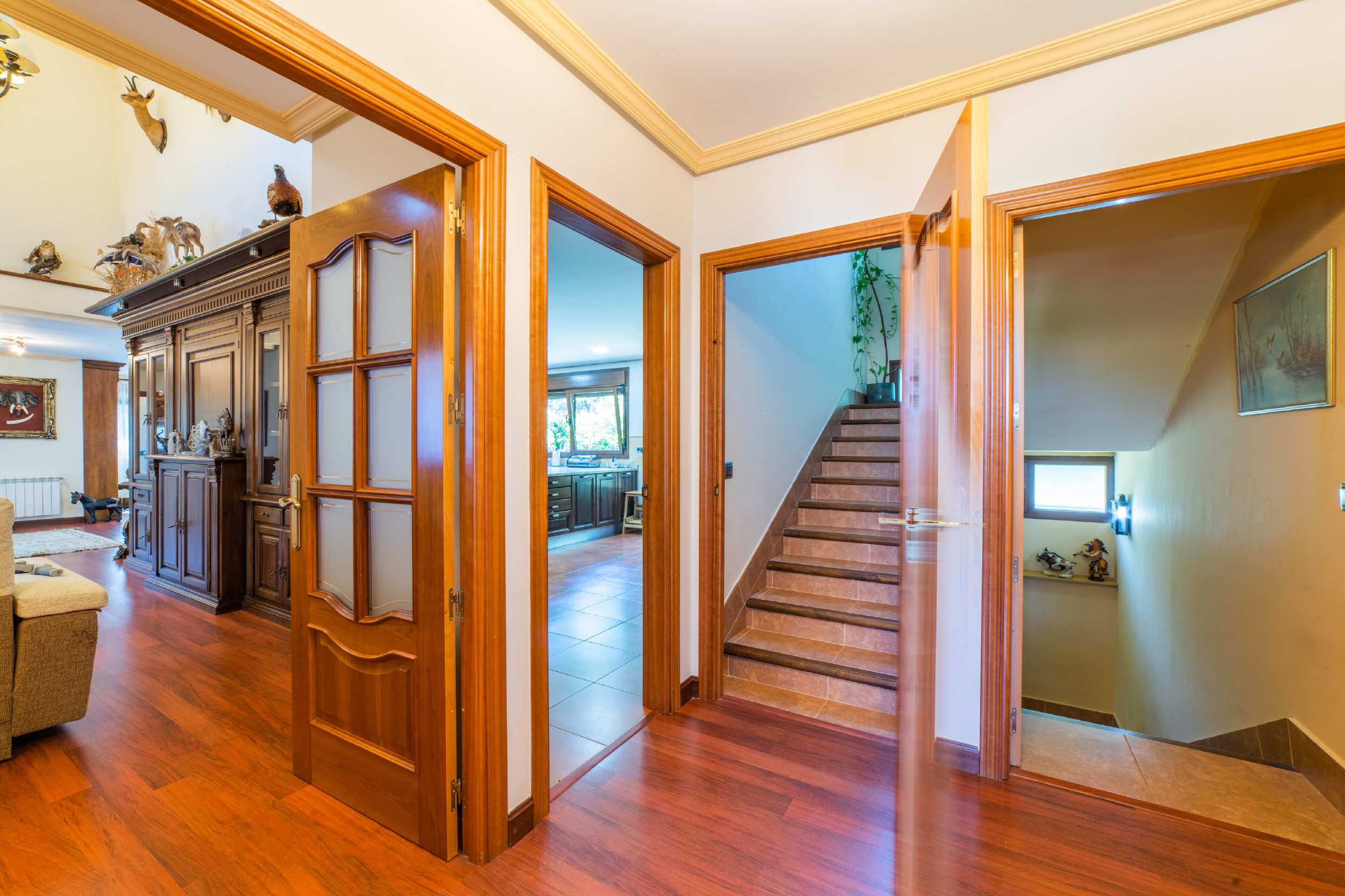Una imponente puerta de madera da la bienvenida al hall de entrada. A la derecha, el salón se abre con un área de sofás y grandes ventanales que miran al jardín, destacando por su techo de aproximadamente 6 metros de altura que permite vistas al pasillo distribuidor de la última planta. Magnifico porche exterior a continuación del salón con increíbles vistas a la sierra, entorno sin ruidos de carretera ideal para disfrutar de la naturaleza.