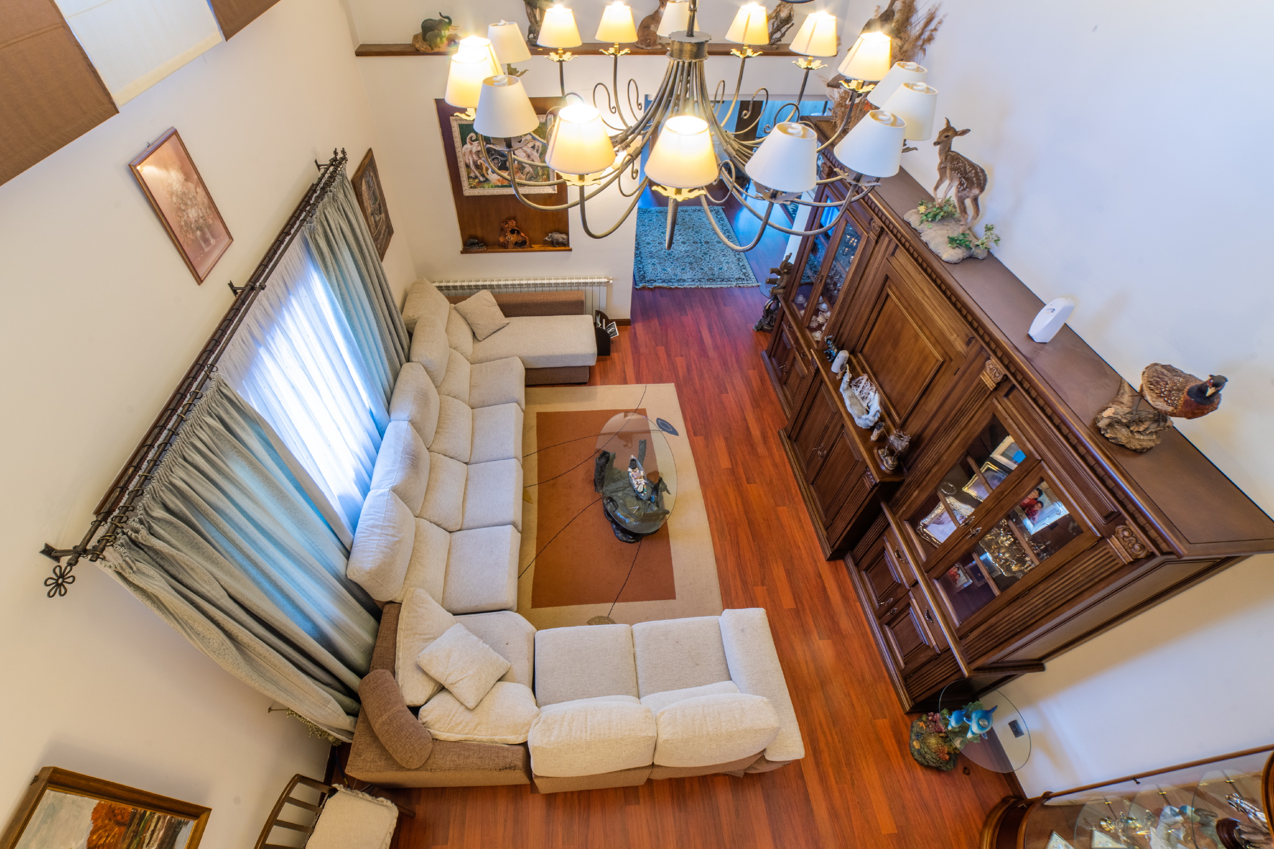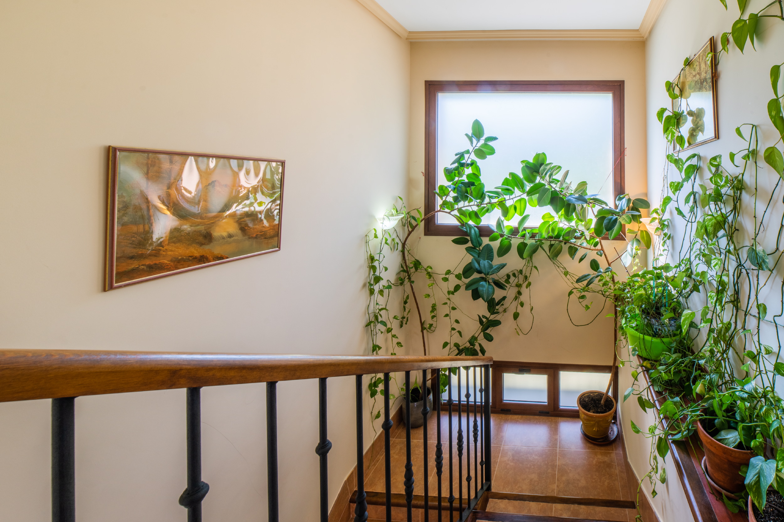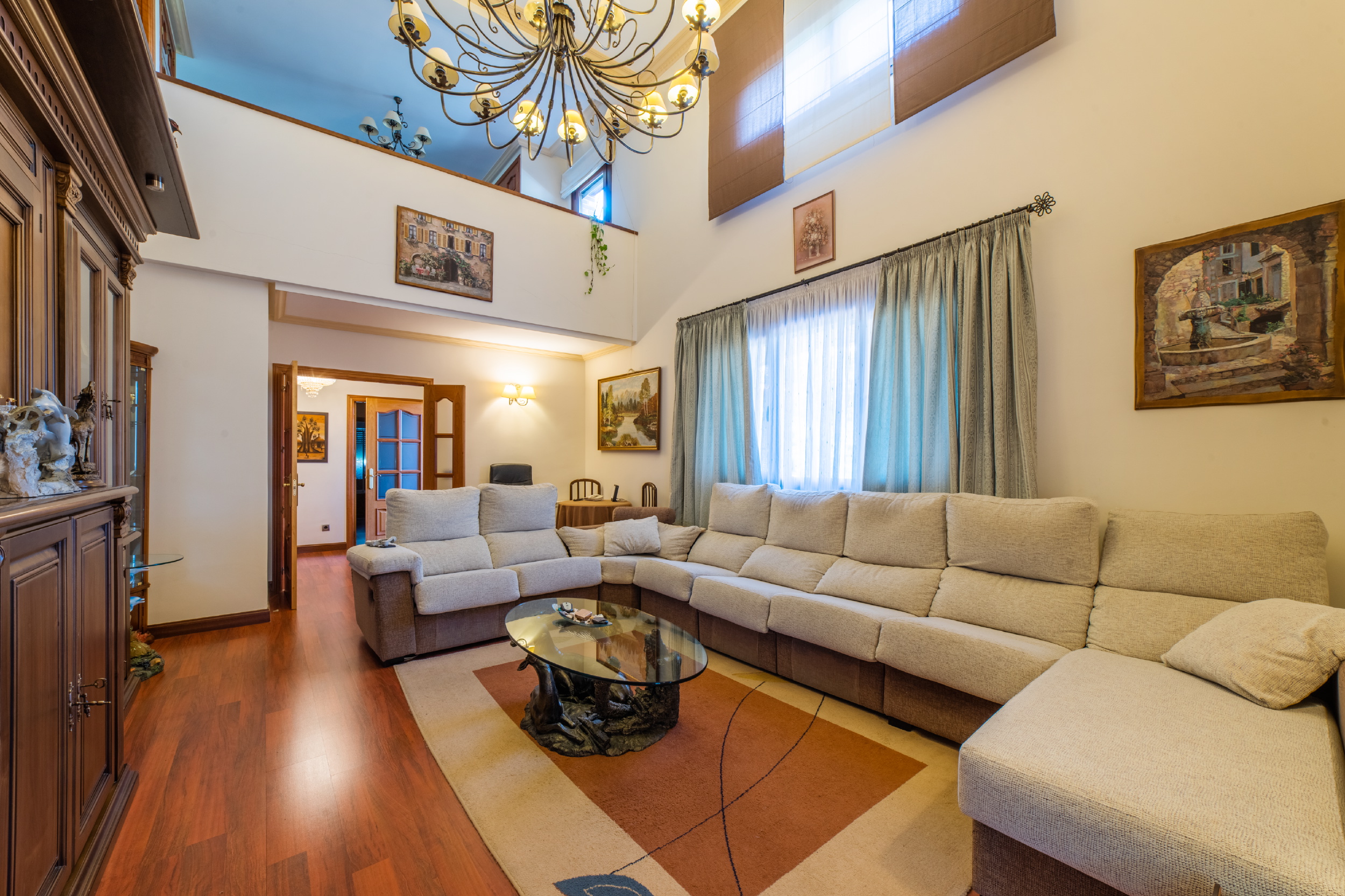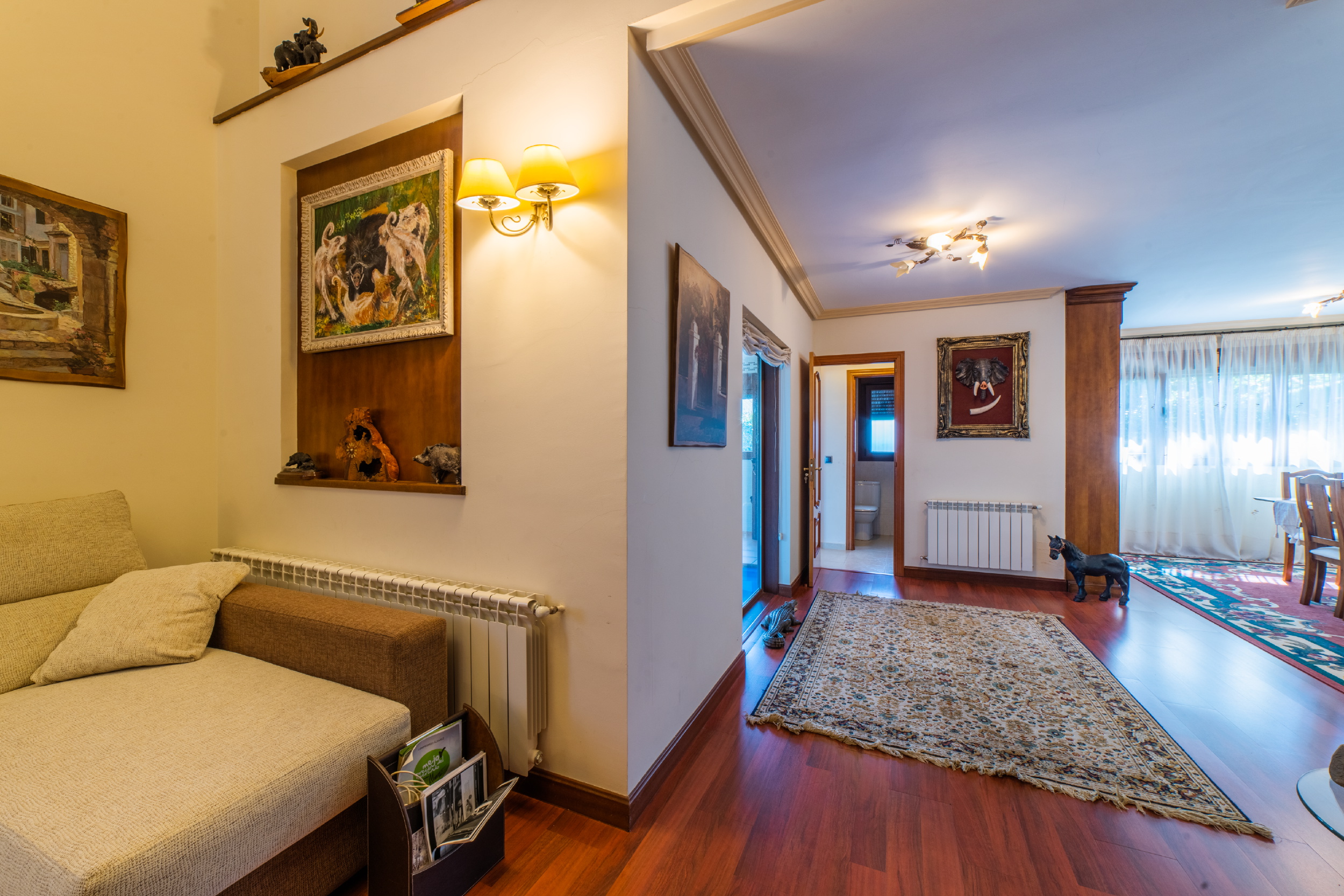 Una imponente puerta de madera da la bienvenida al hall de entrada. A la derecha, el salón se abre con un área de sofás y grandes ventanales que miran al jardín, destacando por su techo de aproximadamente 6 metros de altura que permite vistas al pasillo distribuidor de la última planta. Magnifico porche exterior a continuación del salón con increíbles vistas a la sierra, entorno sin ruidos de carretera ideal para disfrutar de la naturaleza.