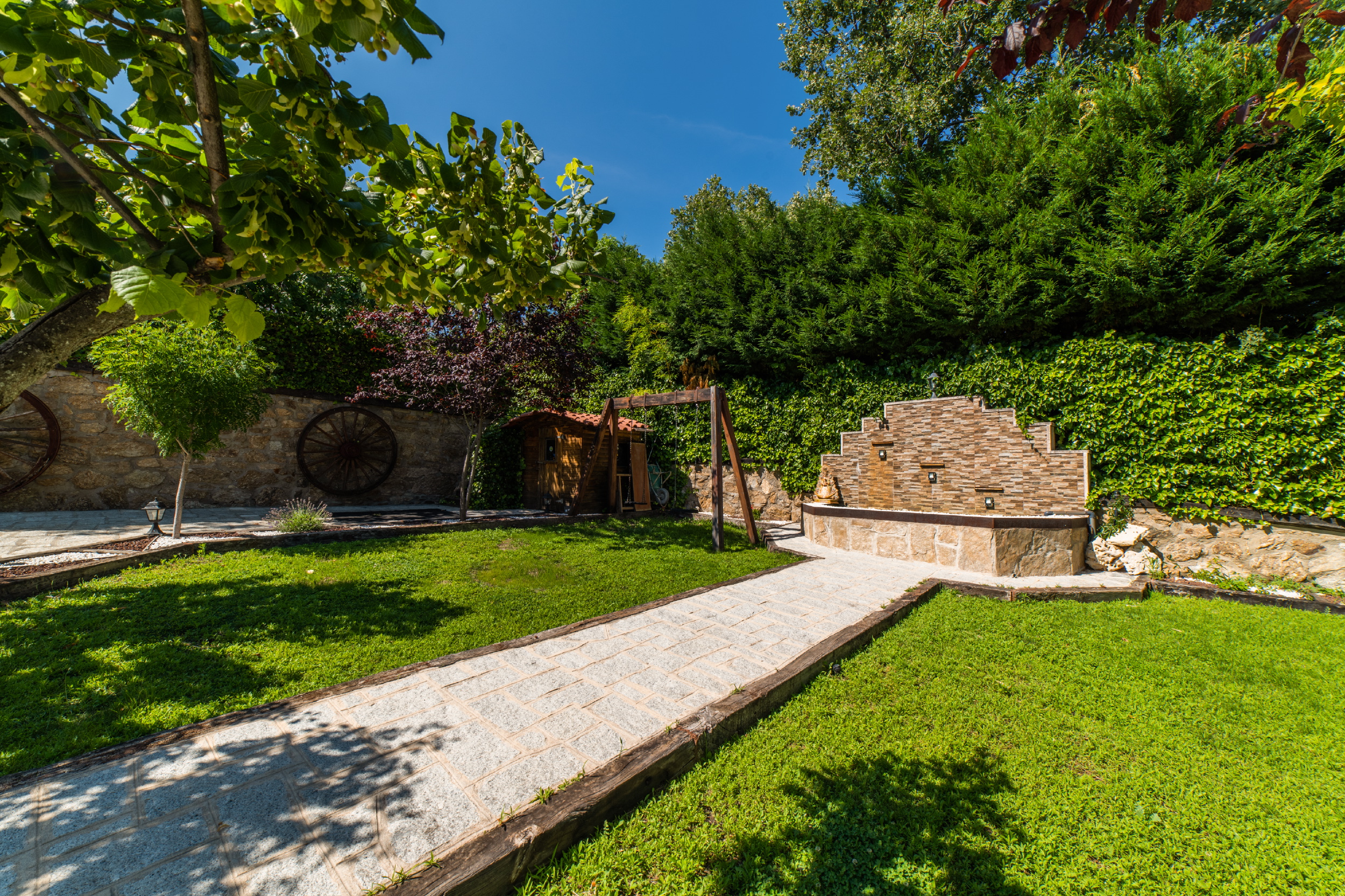 Rodeada por un magnífico jardín, esta propiedad se distribuye en tres plantas e incluye un garaje cubierto para dos coches. La planta baja, accesible desde el garaje, se presenta como un espacio abierto con una gran chimenea de piedra, ideal para reuniones familiares o con amigos, y cuenta con un baño completo, una pequeña cocina, y un despacho o habitación adicional.