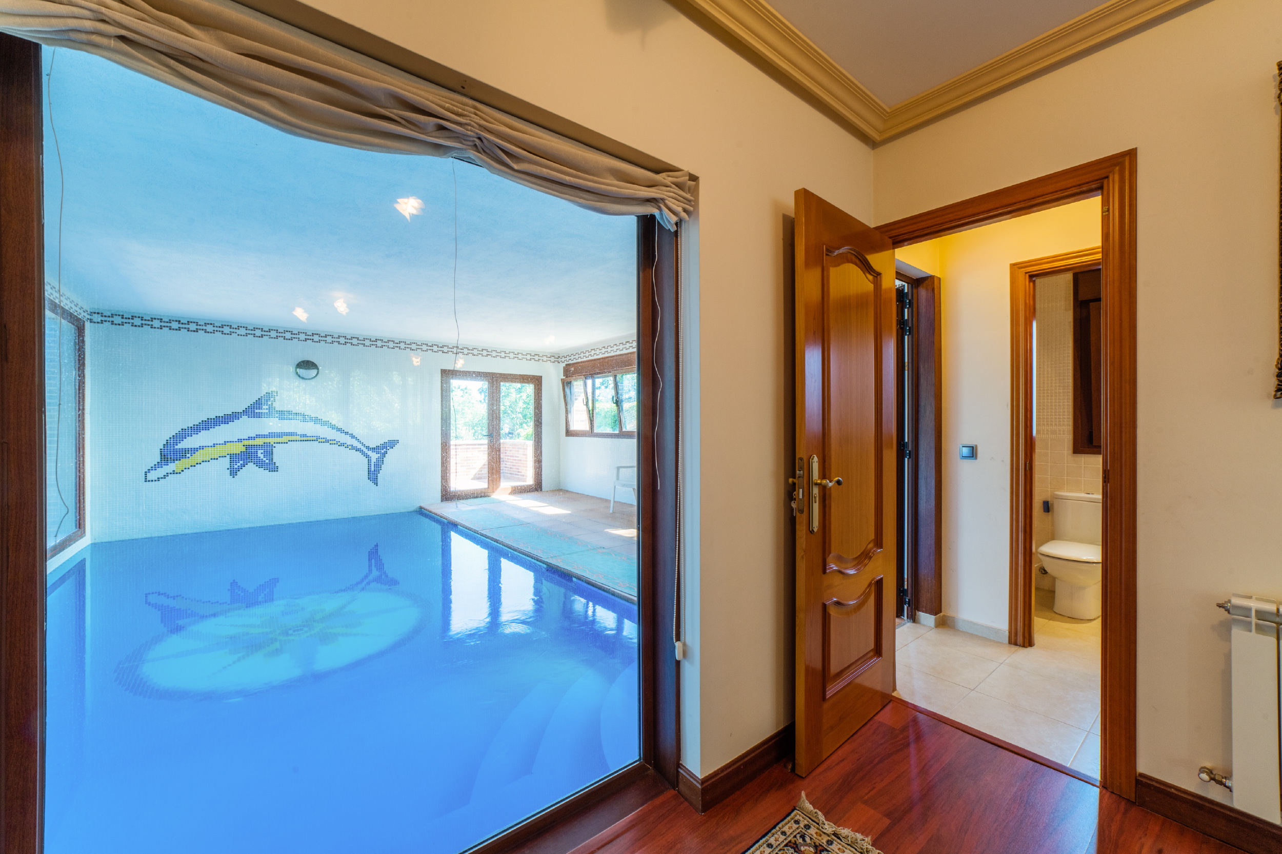 Jardín, garaje para tres coches, piscina interior, área de barbacoa.