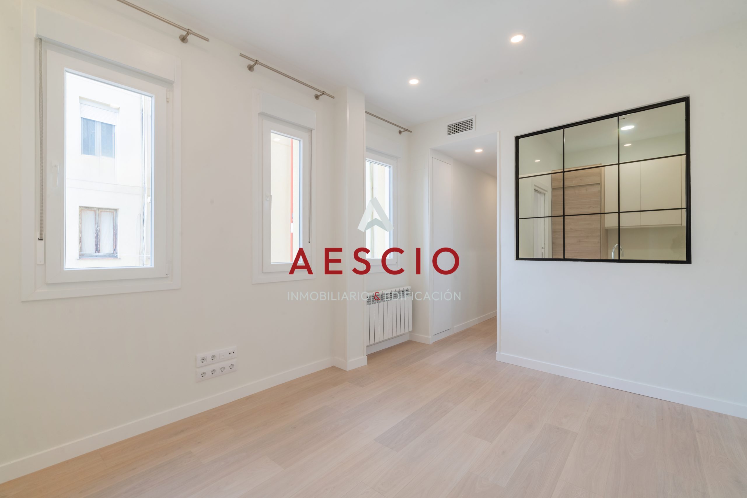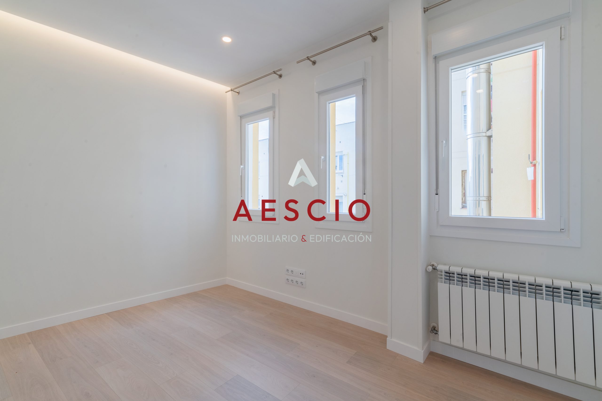 Al acceder al piso, nos recibe un elegante hall con techos altos. La abundancia de ventanas dota a la vivienda de una luminosidad cálida y envolvente. Un pasillo distribuidor nos da acceso a las dos habitaciones, ambas con armarios empotrados de suelo a techo, que aprovechan al máximo la magnífica altura de la vivienda.