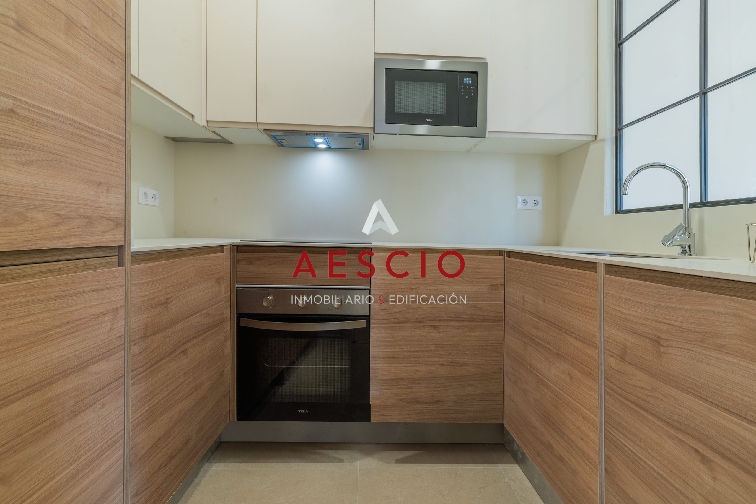 La cocina independiente, conectada visualmente con el salón mediante un gran ventanal interior, aprovecha la luminosidad del espacio principal. Este diseño aporta amplitud y conexión visual, integrando la vida de ambos ambientes.
